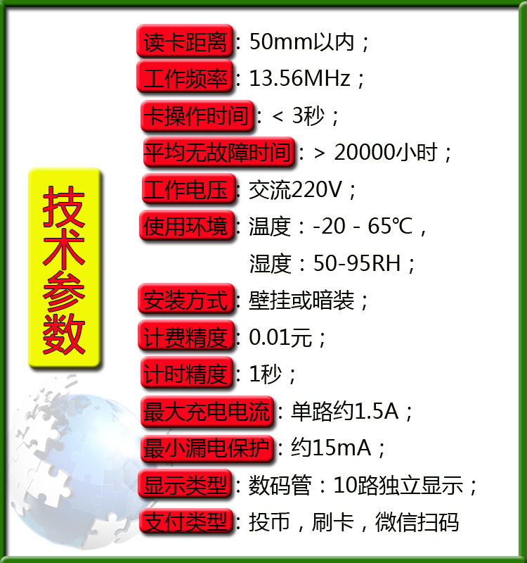 本产品解决了小区物业因电动车充电所带来的一系列问题:私拉电线极易造成安全隐患;电动车随意停放有损小区形象;包月充电电费难以收取;免费充电电费总开支高等。